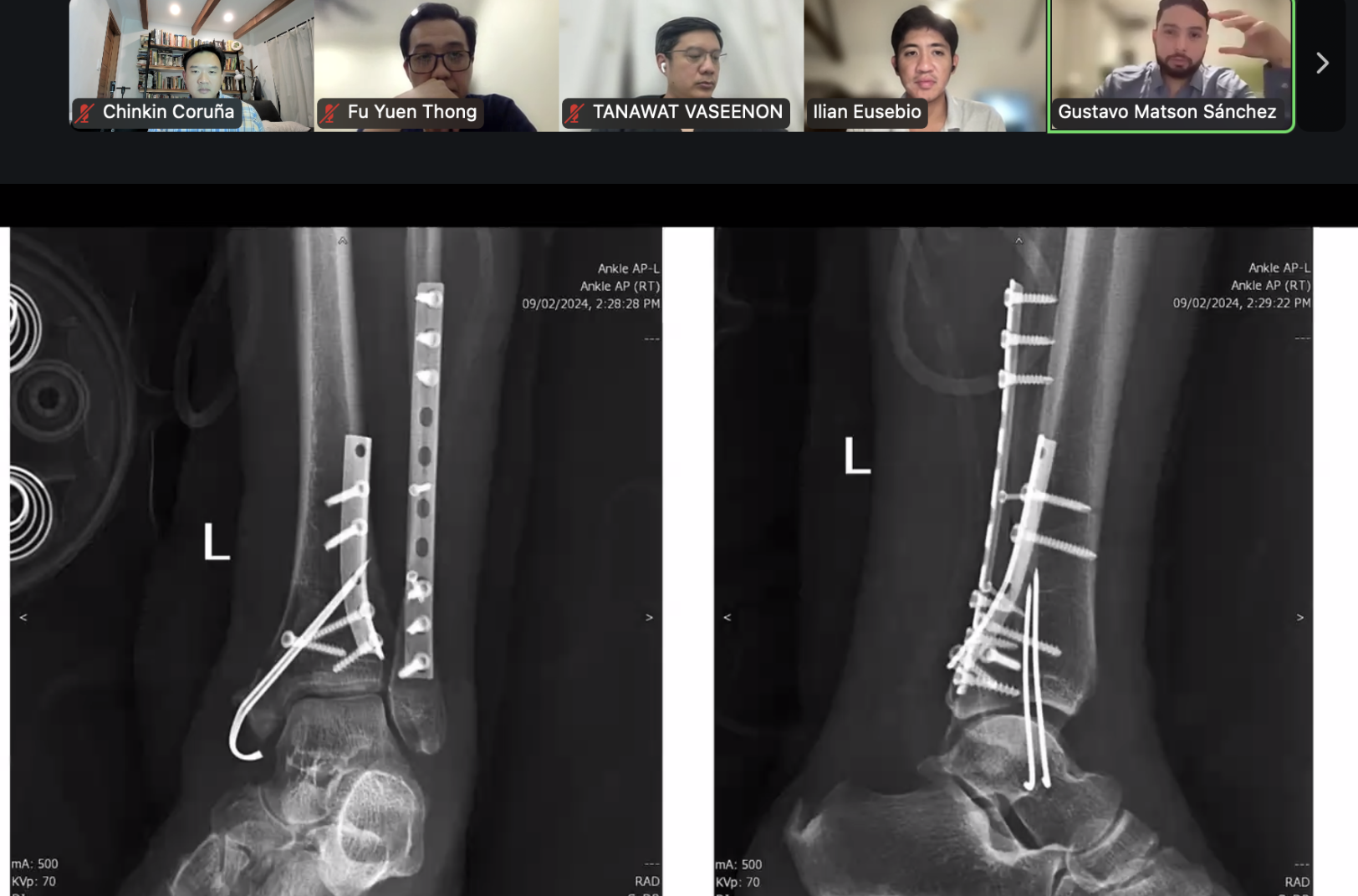 (Via Zoom) From left: Drs. Coruña, Thong, Vasseenon, Eusebio and Sanchez discuss a difficult ankle injury from the Ilocos Training and Regional Medical Center.